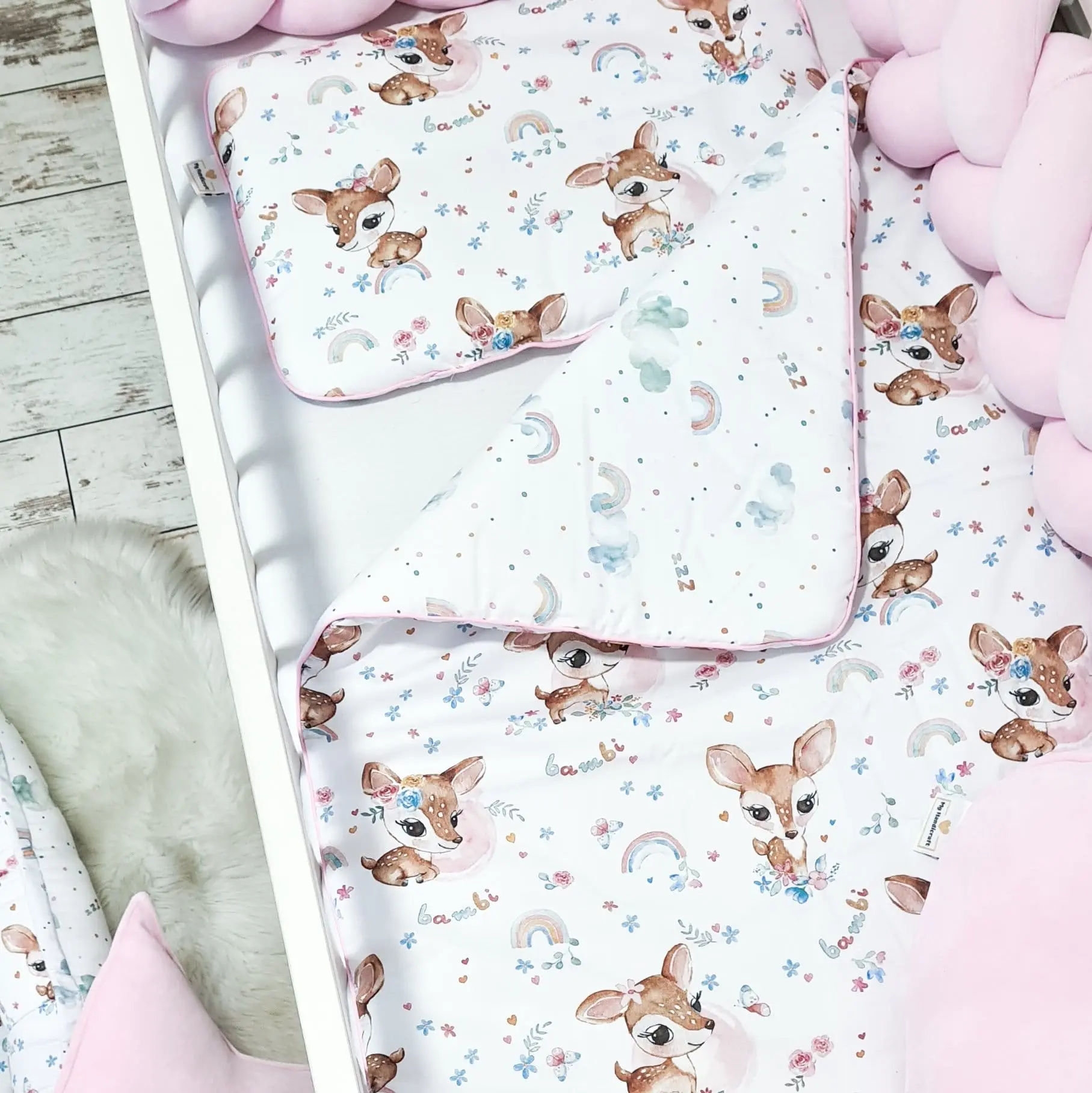 Poznaj pościel dziecięcą Bambi, wykonaną z najwyższej jakości bawełny premium, ozdobioną wyjątkowym printem z uroczym jelonkiem. Motyw inspirowany naturą wprowadzi do pokoju dziecka ciepło i magiczną atmosferę. Wybierz wykończenie z delikatną falbanką lub subtelną wypustką, aby dodać pościeli niepowtarzalnego uroku.