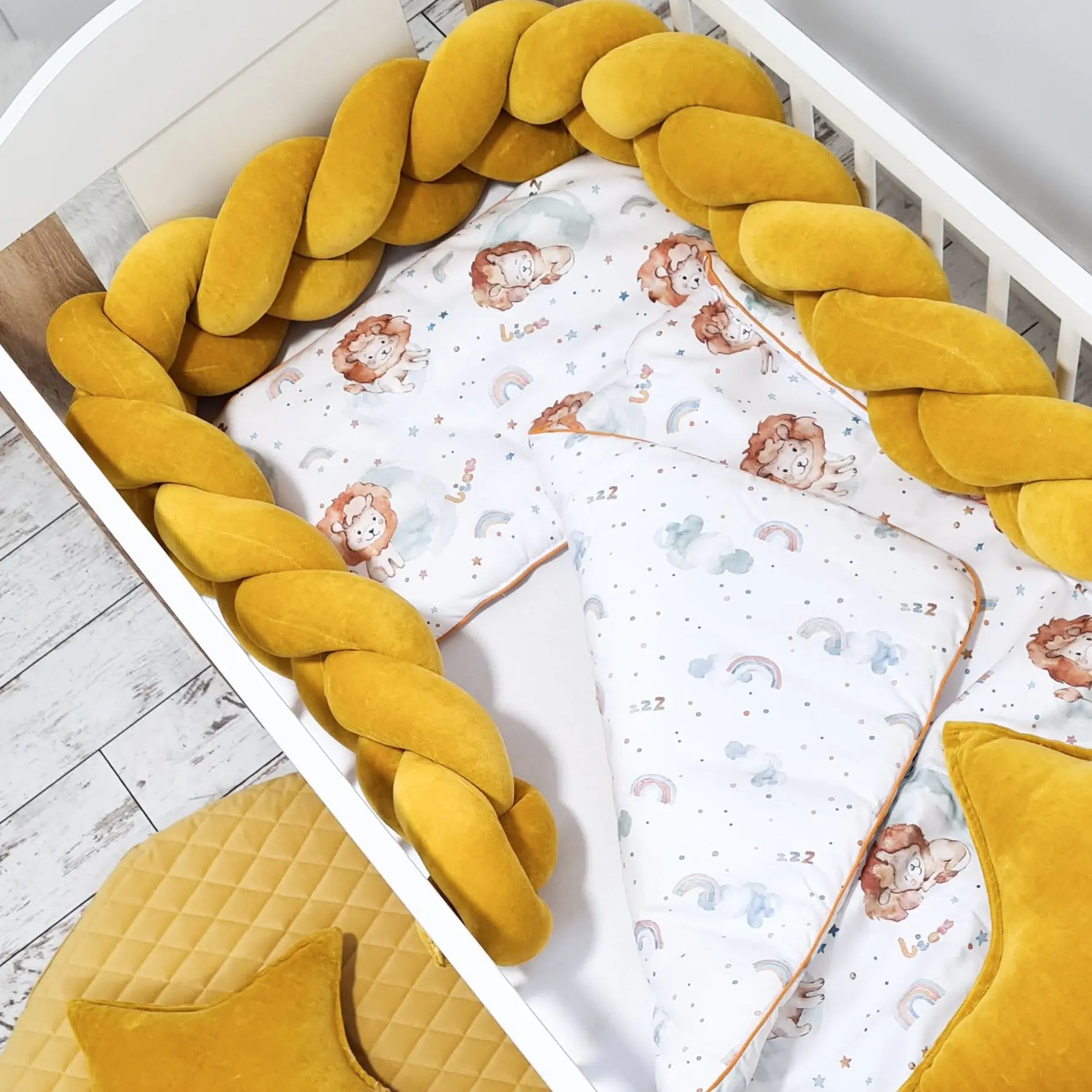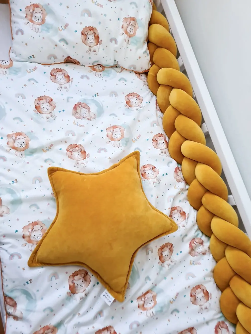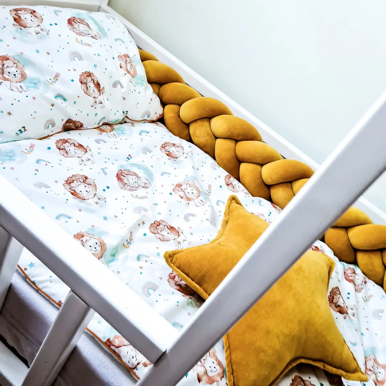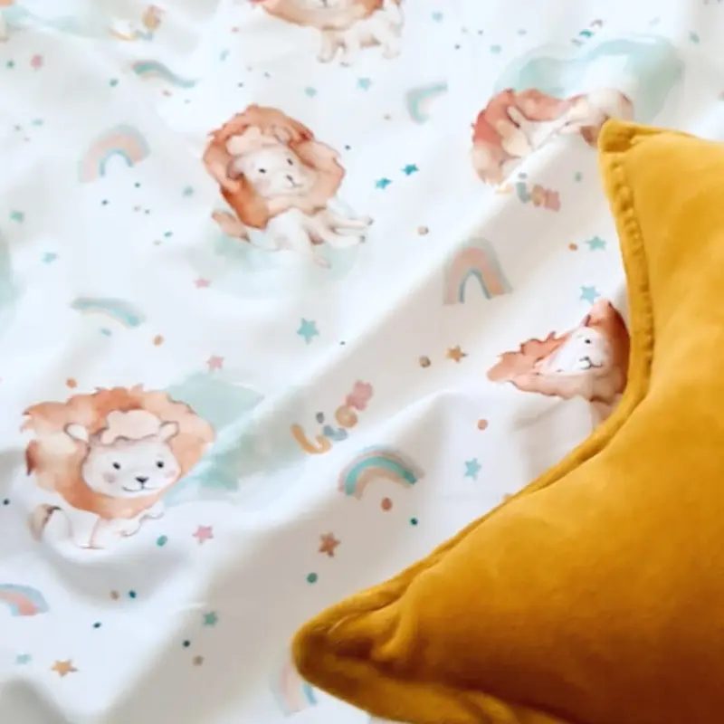 Pościel bawełniana z wypełnieniem nasz autorski wzór Lion, pościel dwustronnie wykonana jest z bawełny premium ze wzorem, prawa strona to wzór z lwami, tył pościeli to bawełna premium w tęcze.Pościel jest dwustronna i ozdobiona piękną ozdobną wypustką, a składa się z kołdry oraz poduszki.