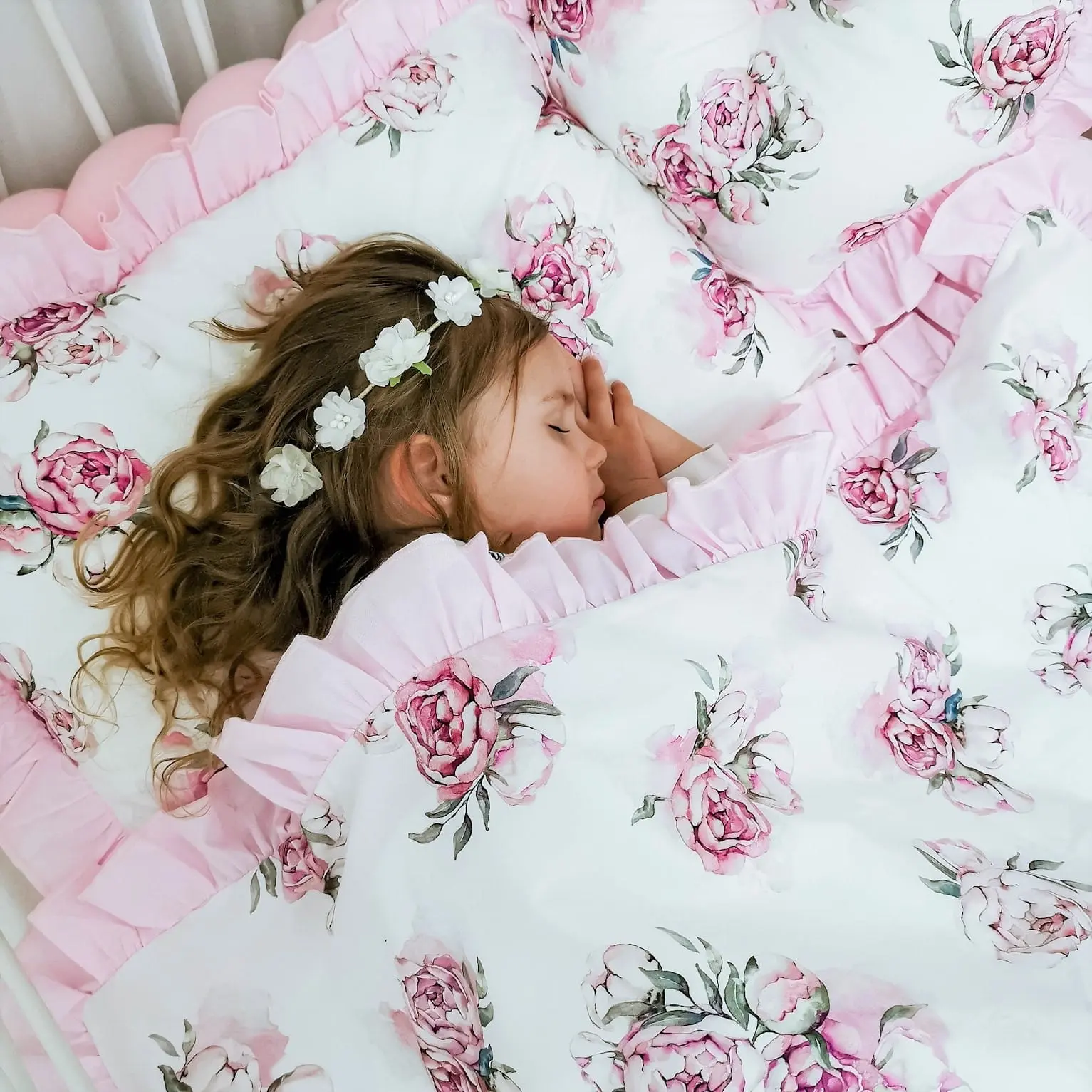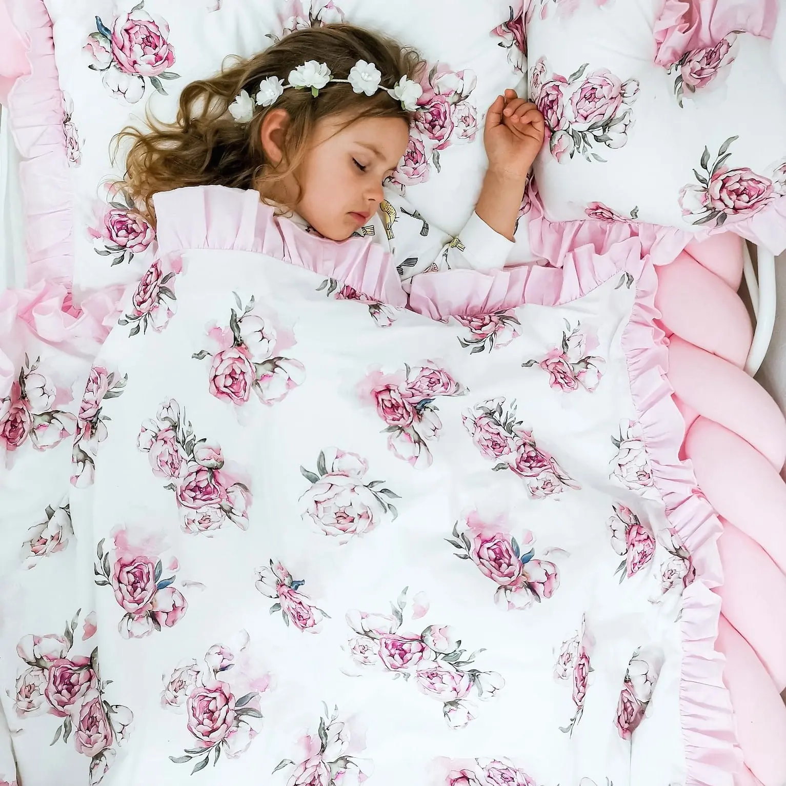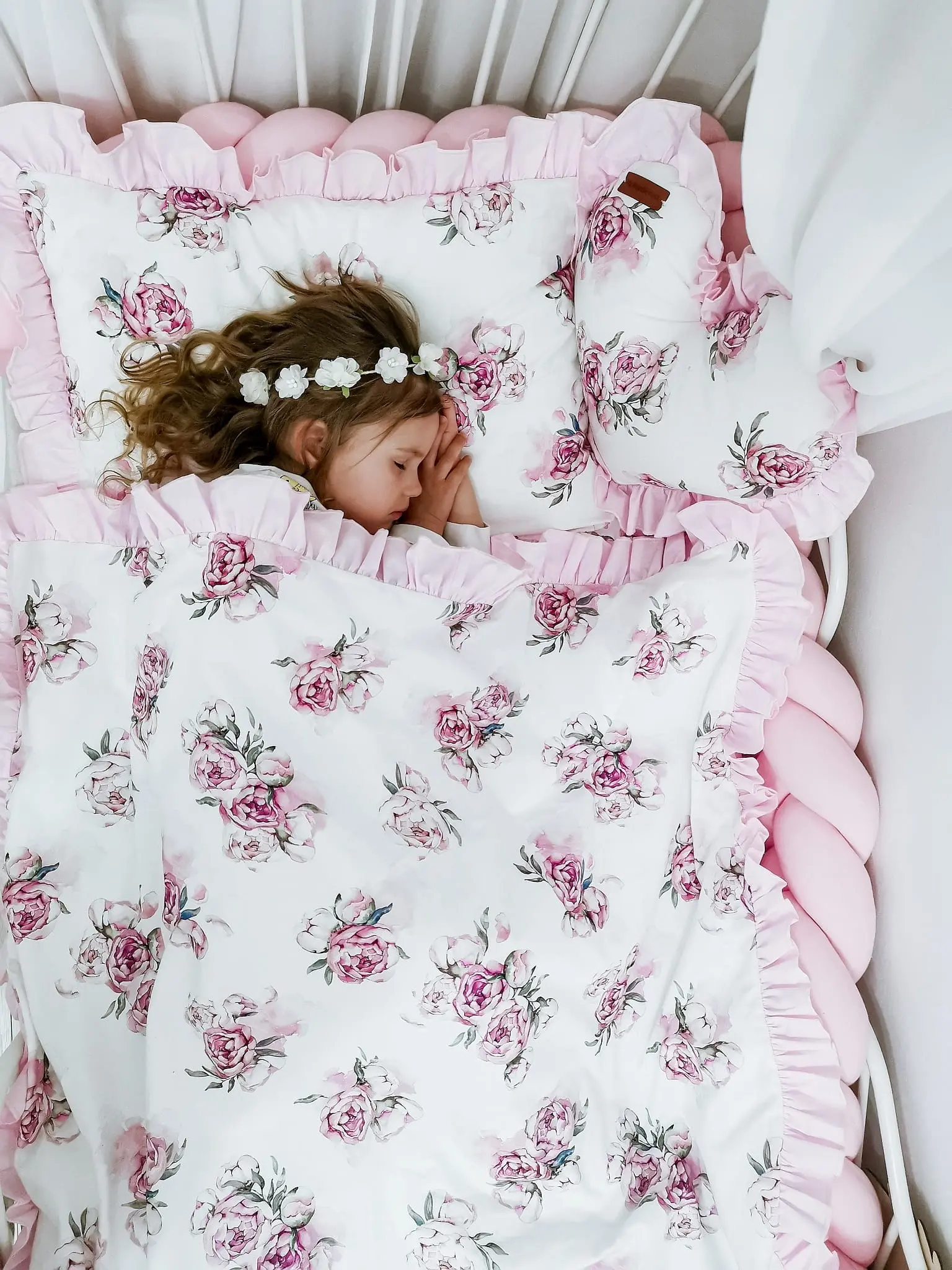 Pościel bawełniana z wypełnieniem nasz bestselerowy wzór Cotton Rose, pościel z prawej stronie ma wzór, tył pościeli to gładki róż, całość wykończona piękną ozdobną falbanką.